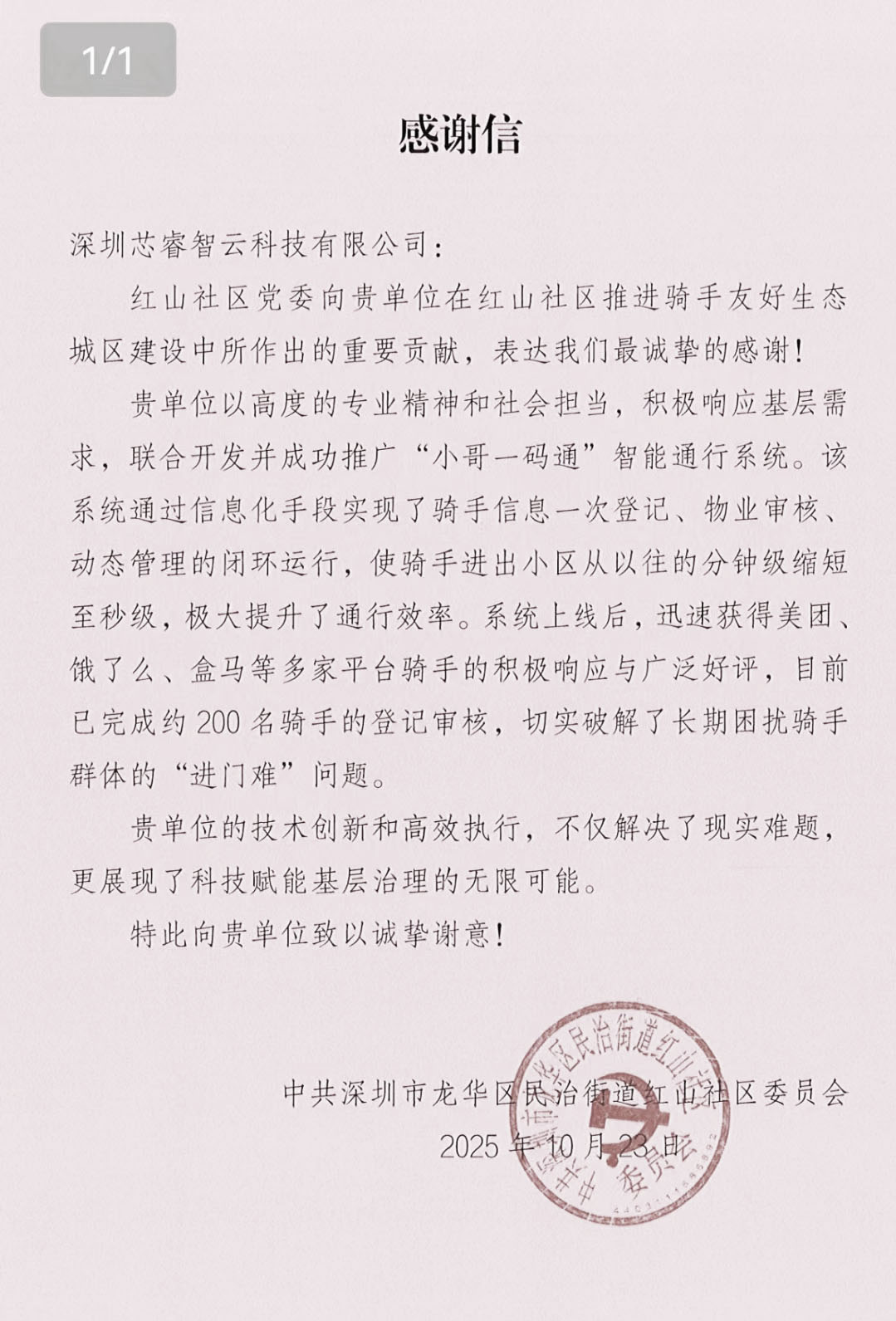 深圳芯睿智云科技有限公司【芯睿智荟-街道社区服务管控系统】凭借专业能力,联合深圳龙华红山社区党委开发“小哥一码通”智能通行系统,实现骑手信息一次登记、动态管理,通行效率从分钟级提升至秒级,有效解决“进门难”问题。系统获多家平台骑手好评,充分展现科技赋能社区智慧管理的价值。红山社区委员会特别发专函表达感谢!